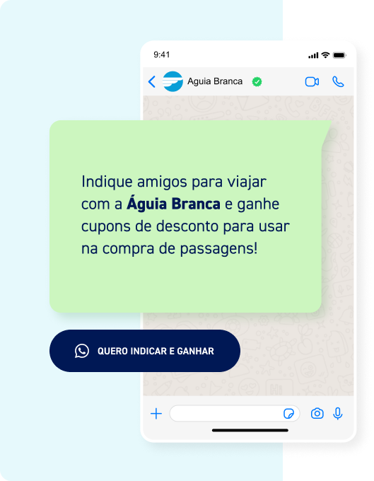 Entre em contato através do Clique Passagem (WhatsApp - 27 4004-1010) e escolha a opção da promoção nas opções de atendimento. Após a adesão, você receberá um link para compartilhar com seus contatos. Quando 5 contatos diferentes fizerem o cadastro no WhatsApp da Águia Branca por meio do seu link, você receberá 1 cupom de 30% de desconto para usar em uma passagem. Quanto mais você compartilhar o seu link, maior a chance de converter um novo cadastro. Durante o período da promoção, você poderá receber até 3 cupons de 30% de desconto. Ou seja, poderá converter até 30 novos cadastros.